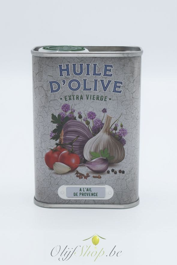 Een mooi retro blikje met extra vierge olijfolie en look uit de Provence.