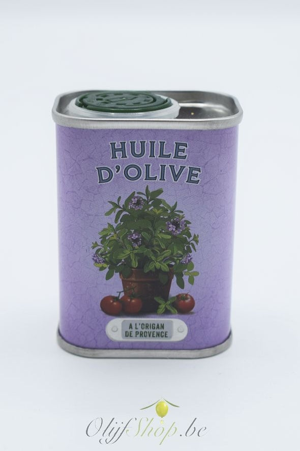 Een knoddig retro blikje met extra vierge olijfolie en oregano uit de Provence.