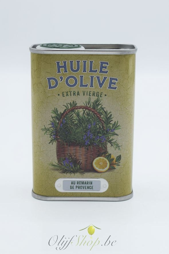 Een knoddig retro blikje met extra vierge olijfolie en rozemarijn uit de Provence.